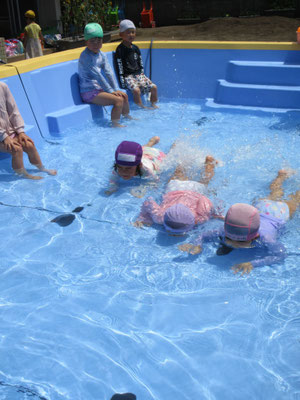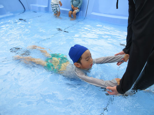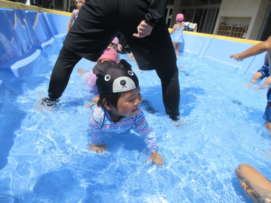 さくら組(年長児)は着衣泳を行いました。衣服と靴では、水着と違って歩きにくくなることを体験しました。次はペットボトルを抱えて自分で浮くことの練習です。怖さから体が丸まってしまう姿もありましたが、力を抜いて上を向き、呼吸ができる姿勢をとることを教えていただきました。水の事故の多い夏、楽しむだけではなく命を守ることの大切さを学ぶ貴重な時間となりました。