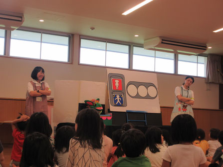 2025/10/02 ふじ組保育参観 9月26日ふじ組の保育参観で交通安全教室を行いました。始めに大型紙芝居で、交通ルールについて教えてもらいます。横断歩道を渡るときは?の質問に「右を見て、左を見て…」と保護者の方と一緒に確認し合いながら楽しんで参加していました。 園庭では横断歩道を使った実践に挑戦。保護者の方と手を繋ぎ、手を上げて横断歩道を渡りました。 普段のあそびや食事の様子などを通して、園生活での姿や子どもたちの成長を感じてもらえたかと思います。お忙しい中ご参加いただきありがとうございました。 tagPlaceholderカテゴリ: